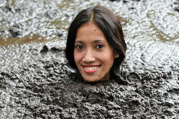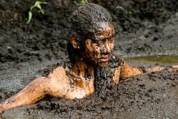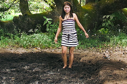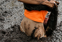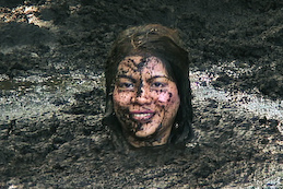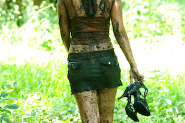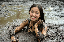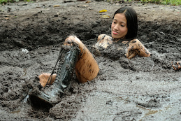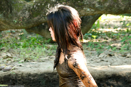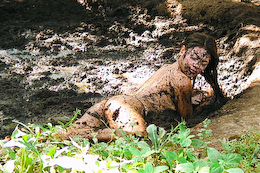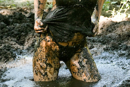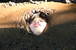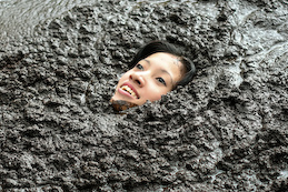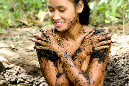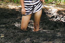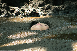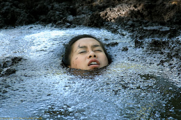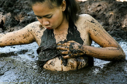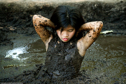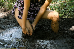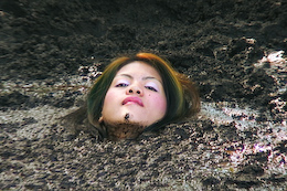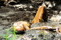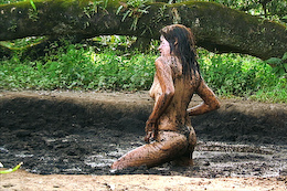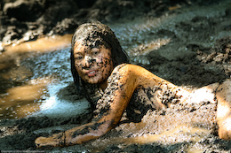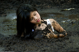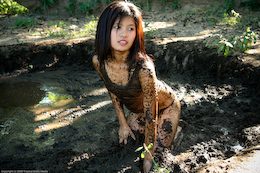 revealing soft, innocent looking breasts, caked in wet peat. Her